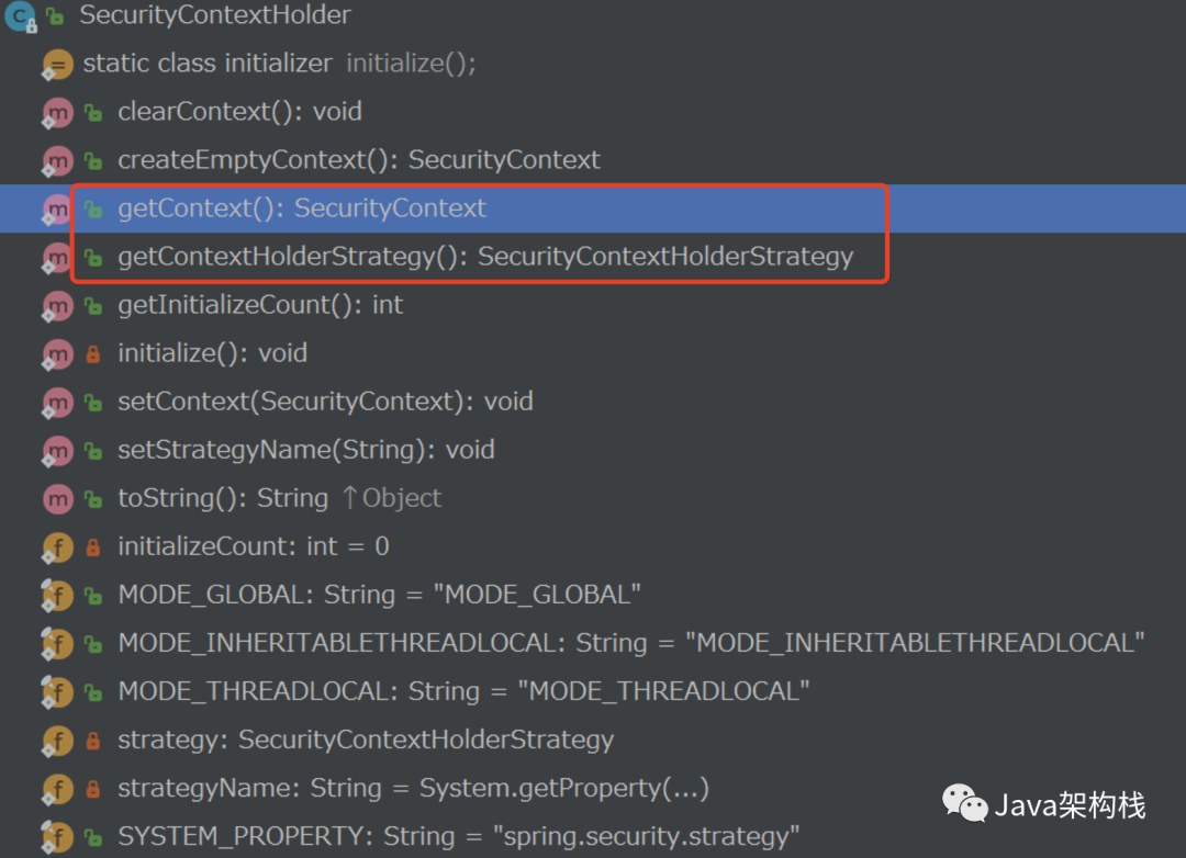 在 SecurityContextHolder 中定义了一系列的静态方法,而这些静态方法的内部逻辑基本上都是通过 Security Context Holder 所持有的Security Context Holder Strategy对象来实现的,如getContext()、setContext()、clearContext()等。如下图所示: