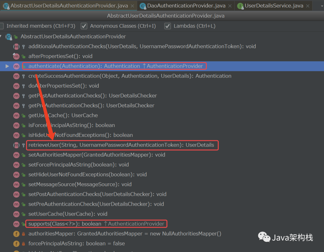 (4)AbstractUserDetails Authentication Provider类中的authenticate (authentication)方法内部会调用retrieveUser()抽象方法加载对象;