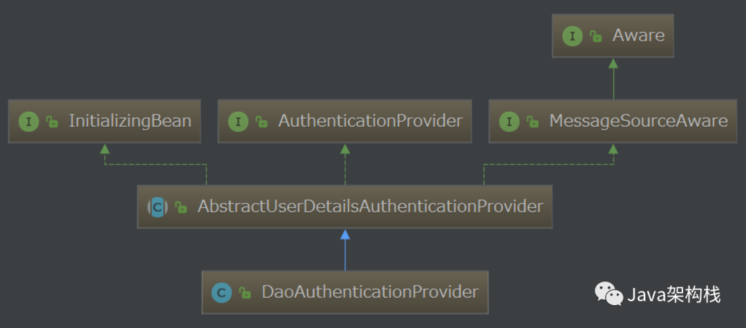 Authen tication Provider接口的一个直接子类是Abstract User Details Authentication Provider,该类又有一个直接子类Dao Authen tication Provider,这三个类之间的关系图如下:
