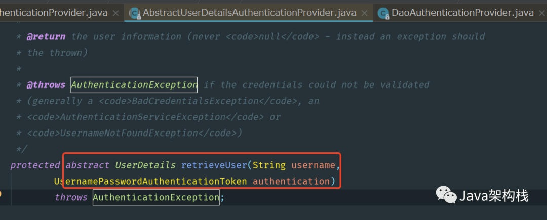 //其中的retrieveUser()方法是个抽象方法,由子类DaoAuthenticationProvider来实现。