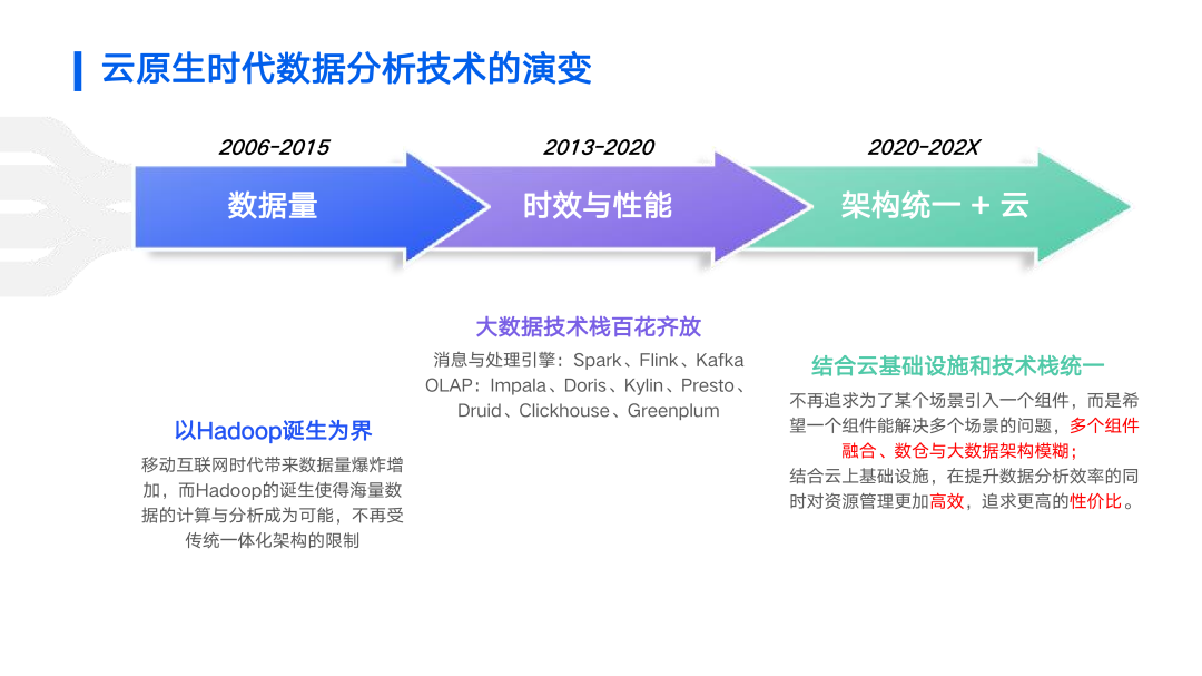 纵观大数据系统的发展演进过程,移动互联网时代带来了数据量的暴增,而从 2006 年起 Hadoop 的诞生解决了海量数据的分析与处理。而随着数据处理分析需求的进一步发展,大数据技术栈百花齐放,新的技术不断出现,其中包括 Kafka、Pulsar 等消息系统以及 Spark、Flink 等流或批处理引擎,OLAP 方向更是有众多的优秀产品出现,例如 SQL on Hadoop 的 Impala、Kylin 以及 OLAP 数据库例如 Doris、Druid、Clickhouse、Greenplum 等,用户可能会选择多个组件来处理不同场景的问题。随着技术的进一步演进,降本增效成为行业趋势,开发者越来越希望统一架构,减少多个系统的运维压力、降低不同系统的学习成本。而随之云时代的发展,将大数据架构构建在云之上成为一种新的选择。