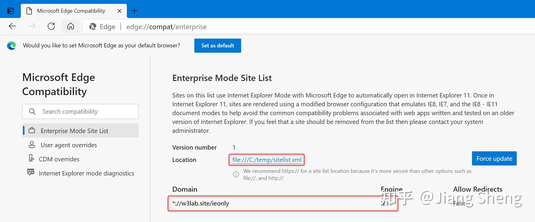 - 每次更新站点列表,需要 <site-list> 根元素的version属性值都往上升,不然Edge不会认为站点列表更新了,当然除非你手动跑去 edge://compat 点击Force update会触发强制更新。
