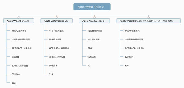 目前市场在售的Apple Watch包括4个型号,即Series 6 / SE / Series 5 / Series 3 ,