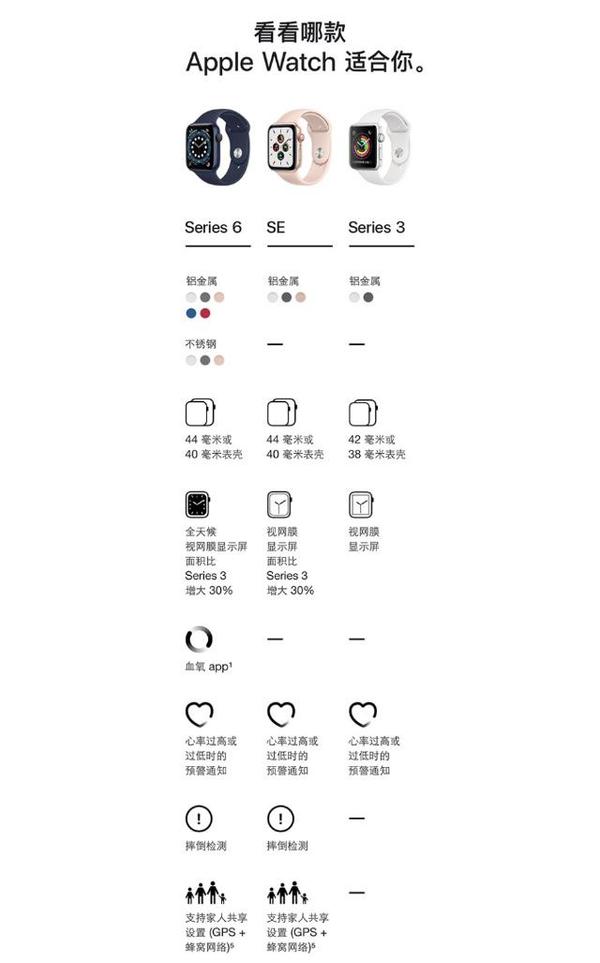 5、由于苹果官网已经下架了 Series 5 , 故而不做重点推荐。如果预算充足,建议考虑最新出的 Series 6, 功能全面,性能也有所提升。如果考虑综合性价比,建议关注 SE, 已经很好用了。假如只需要最基础的功能,希望入手价位最经济的作为体验,就买 Series 3。