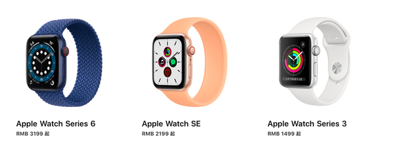 在官网上主要陈列显示的是Series 6 、Series SE和 Series 3三个系列,苹果官方售价分别为3199起、2199起、1499起。