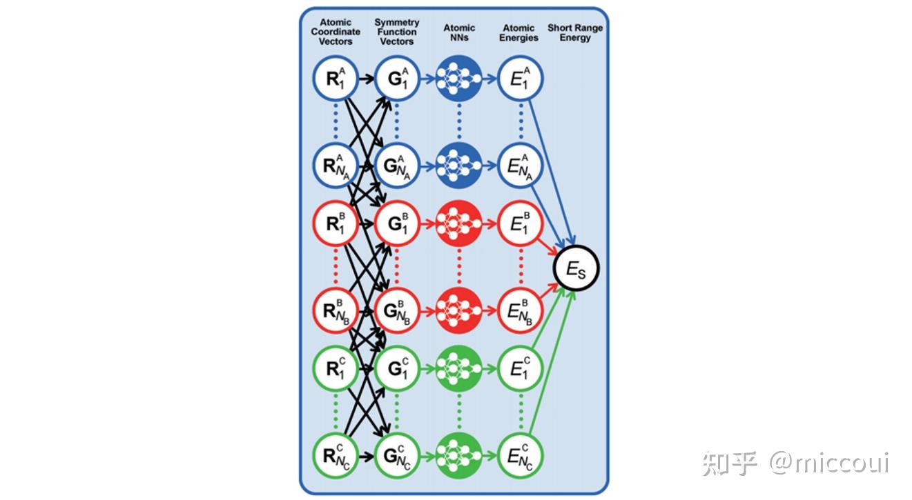 NNPs 的基本思想是采用对称函数矢量描述不同元素、不同原子的邻域环境,然后采用原子神经网络预测不同原子对体系全局性质的贡献。即: