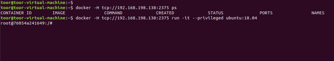 docker -H docker -H tcp://192.168.241.142:2375 run -it --privileged alpine bin/sh