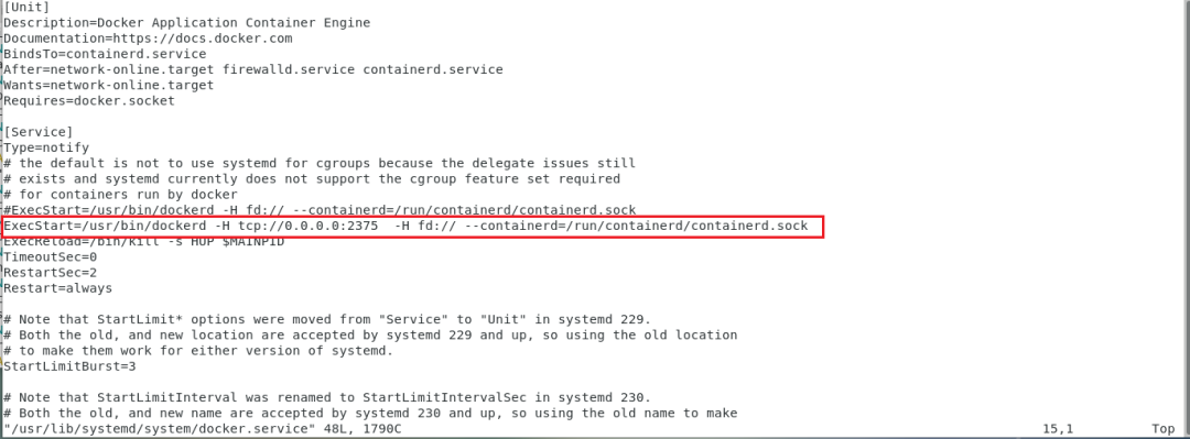 ExecStart=/usr/bin/dockerd -H tcp://0.0.0.0:2375 -H fd:// --containerd=/run/containerd/containerd.sock