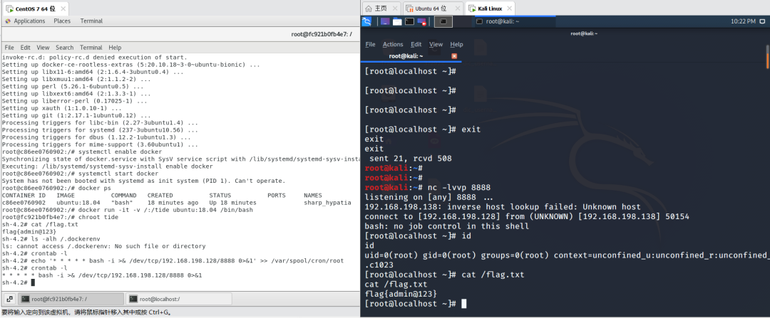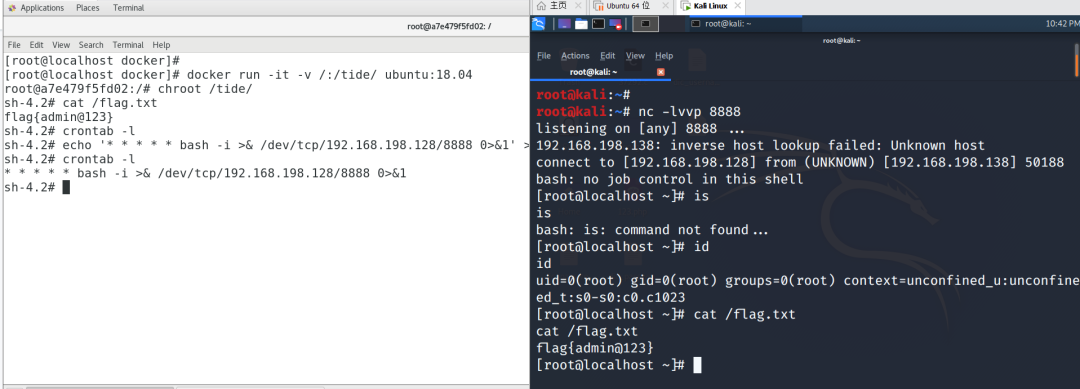 这里可以看到我们现在已经成功跳出了docker容器,获得了宿主机的权限,可以使用计划任务反弹shell