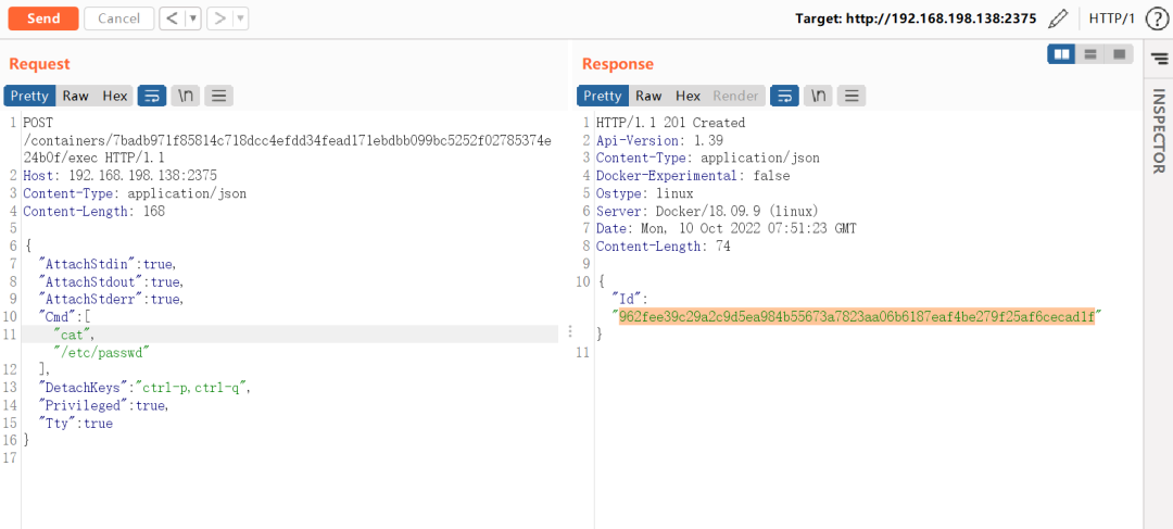 注意其中cmd的字段,这就是我们要执行的命令,发送后会得到第二个id,这里需构造一个exec_start数据包,内容如下。
