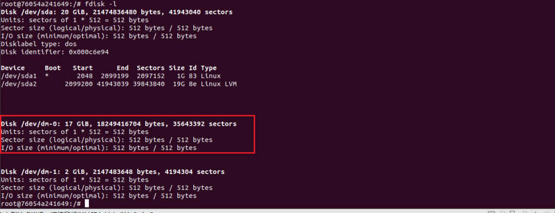 进入容器后,使用fdisk -l命令查看磁盘文件