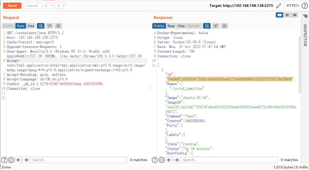 然后发送就会得到结果,至此成功获得该docker主机的rce权限,但无法逃逸到宿主机中。