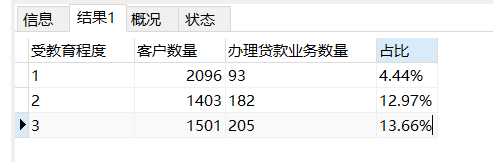 CONCAT(round(SUM(CASE WHEN personal_loan=1 then 1 else 0 end)/count(education)*100,2),'%') as '占比'