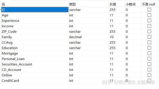 为了方便理解,将字段翻译为中文:id、age(年龄)、experience(工作经验)、income(收入)、zipcode(邮政编码)、family(家庭人数)、ccavg(每月信用卡消费金额)、education(教育水平)、mortgage(抵押)、personal_loan(个人贷款业务)、securities_account(银行证券账户)、cd_account(银行存款账户)、online(银行网上设施)、credit_card(银行信用卡)。