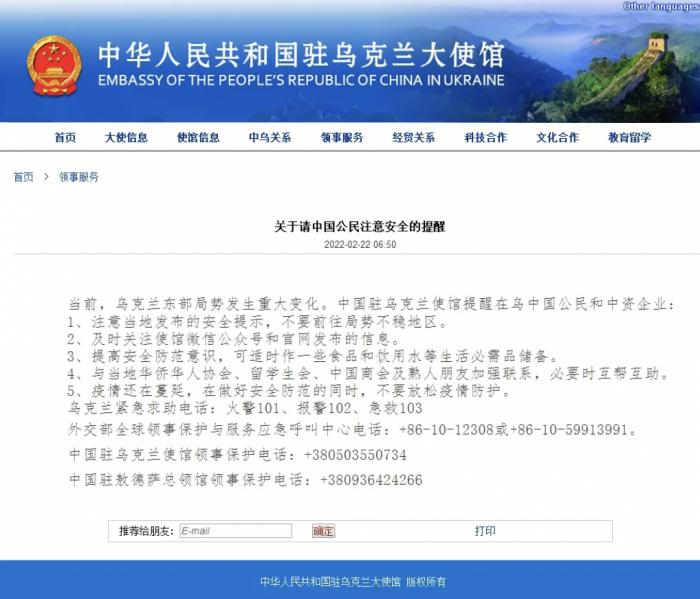中国驻乌克兰大使馆网站22日发布《关于请中国公民注意安全的提醒》。