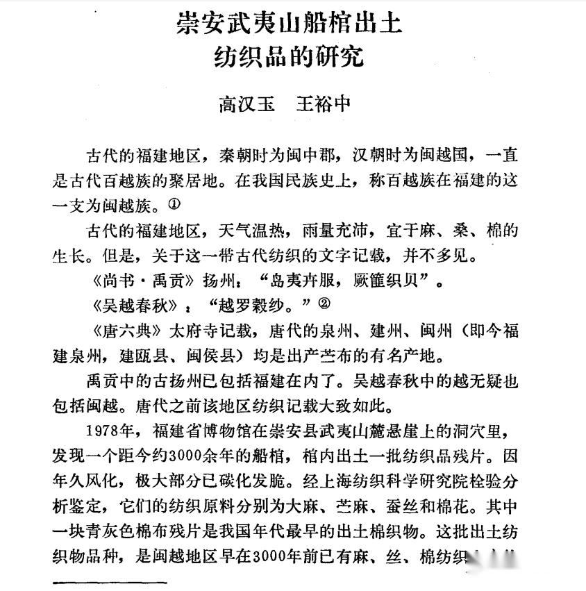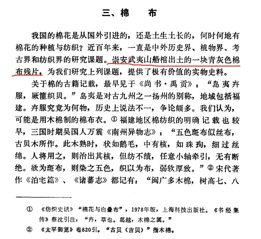 武夷山船棺偏偏出土了棉布残片。武夷山船棺的年代远在公元前1500年以前,比中原殷商早了200年,不但有棉布,而且船棺的制作必须用到金属砍削工具,要么是青铜器,要么是铁器。