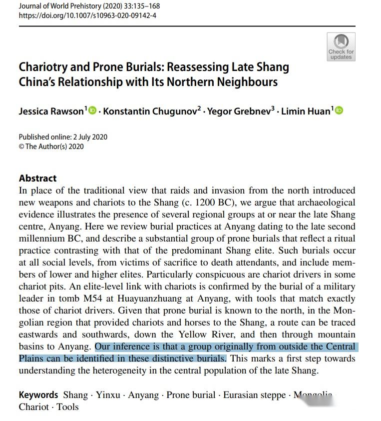 在上一篇小文《关于殷商的起源,关于殷墟大墓亚长的人种,各种谎言真是到了尽头》中,脚趾头轻轻点了一下——但凡看过《 战车和俯身葬:重估晚商中国与北方邻居的关系 》这篇论文的小东西,没有不“魂飞魄散”的。