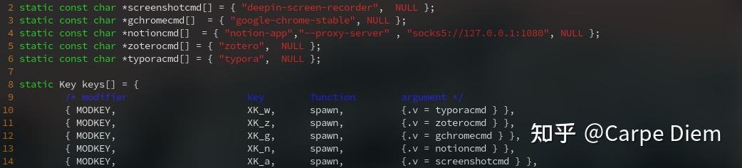 快捷键的设置主要修改dwm的config.def.h,主要是将命令行参数写成下面cmd结尾的字符串数组,然后在keys中定义对应的快捷键即可,这里主要设置了几个常用的快捷键。修改完毕后在dwm目录下删除config.def.h,重新