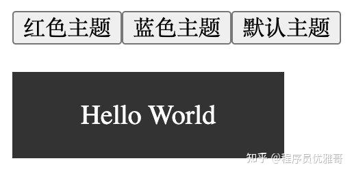 上面代码比较简单, btns 变量定义了三个按钮,通过 v-for 显示三个按钮。点击按钮的时候传递 bgColor 和 textColor 两个参数给点击事件 onBtnClick 函数。显示 Hello World 的 div,通过 --textColor 和 --bgColor 两个变量来控制背景色和文字颜色。