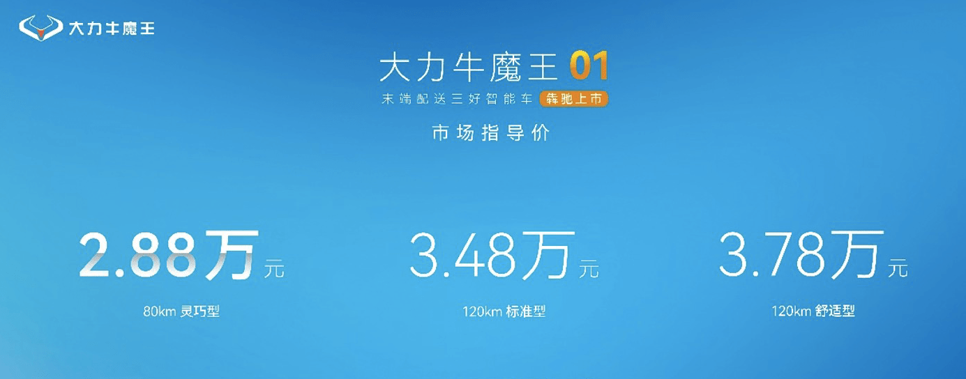 【太平洋汽车 新车频道 】日前, 大力牛魔王01 正式上市,新车共计推出3款车型,售价2.88-3.78万 元 。该车主打“末端配送新品类”,是当前全球最小可 上牌 新能源物流车之一,填补当前末端配送物流车市场的空白,共拥有80公里和120公里两种续航版本可选。目前已经有300台新车交付。
