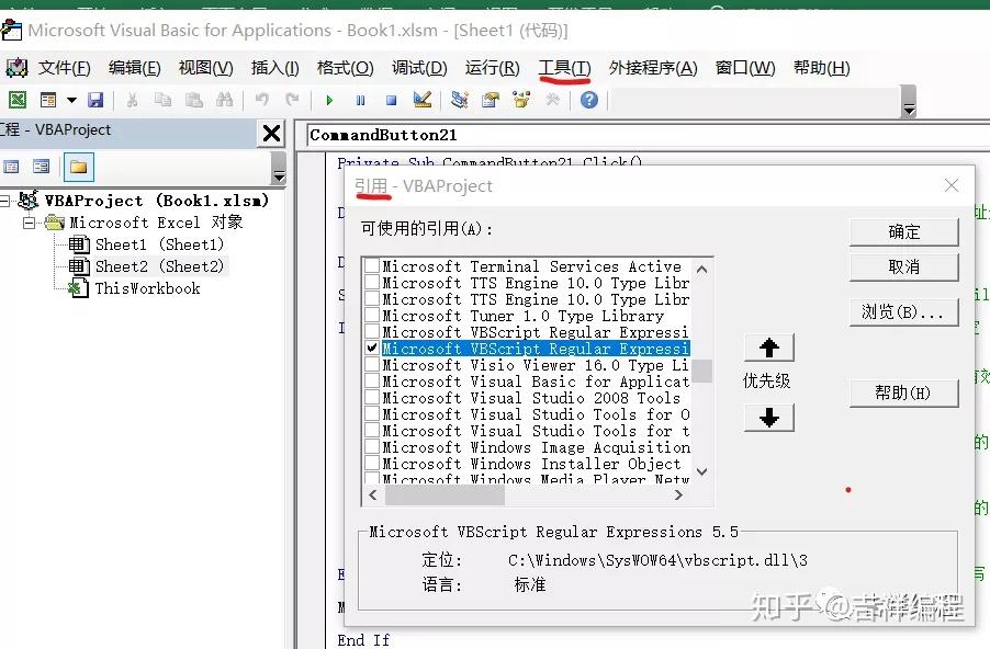 - 在VBA窗口的菜单栏,依次点击工具->引用,然后在弹出窗口中,勾选 Microsoft VBScript Regular Expressions 5.5;