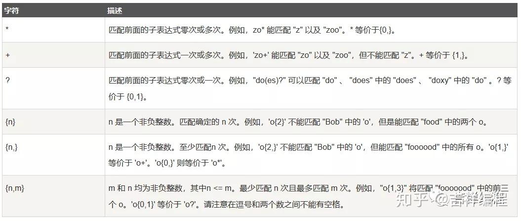 限定符用来指定正则表达式的一个给定组件必须要出现多少次才能满足匹配。有 * 或 + 或 ? 或 {n} 或 {n,} 或 {n,m} 共6种。