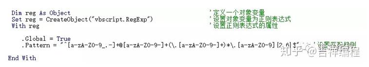 根据上述邮箱的命名规则,我们可以编写正则表达式来判定用户输入的邮箱地址是否符合上述规则,即是否有效?编写的VBA代码如下:
