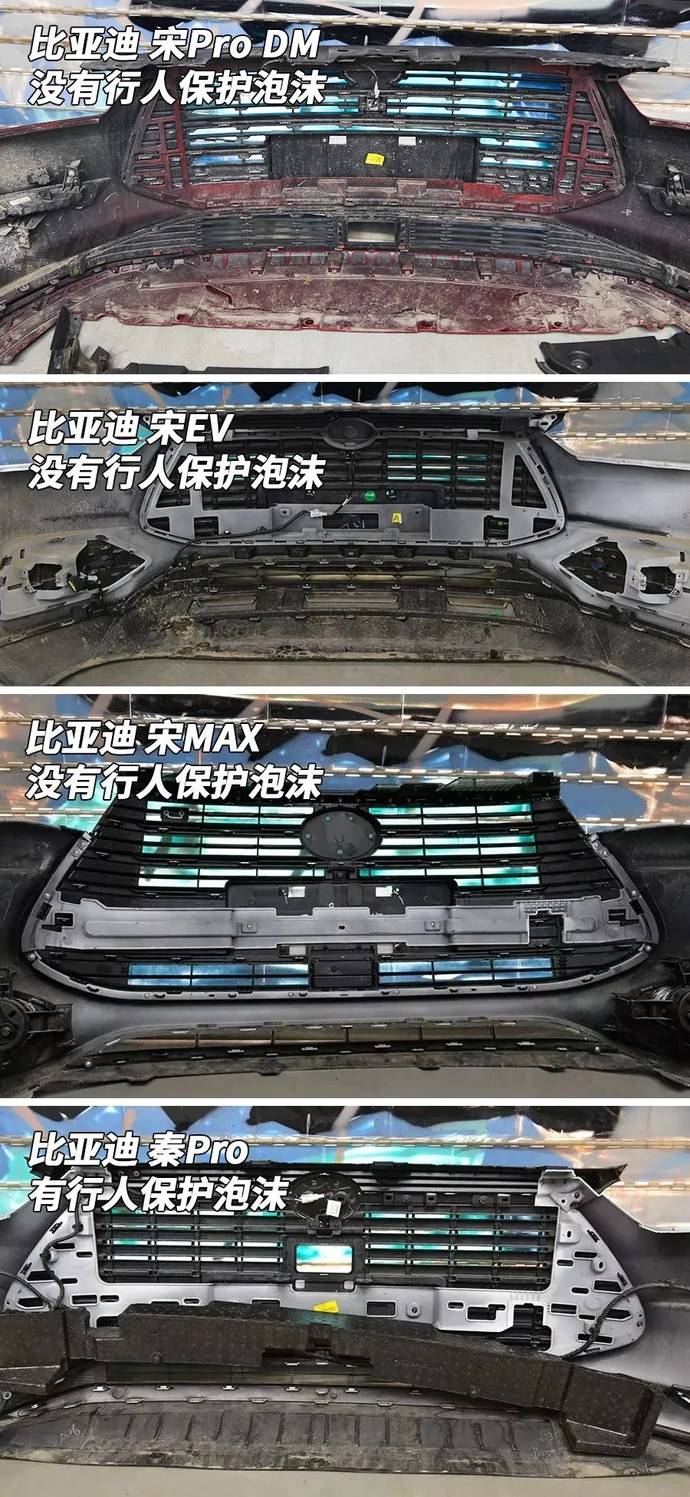 这辆宋Pro DM没有行人保护泡沫,从我们拆的车中发现所有“宋”系列车型都没有泡沫。无论是对行人,还是对自身减少碰撞损失都不友好。