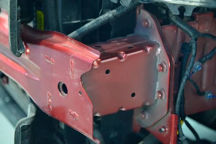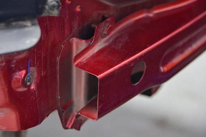 同时我们可以看到,这辆车的纵梁前部也有相应的吸能褶皱,与老式丰田车的设计比较相似。当然,现在丰田更新TNGA平台后,这种设计已经不用了。