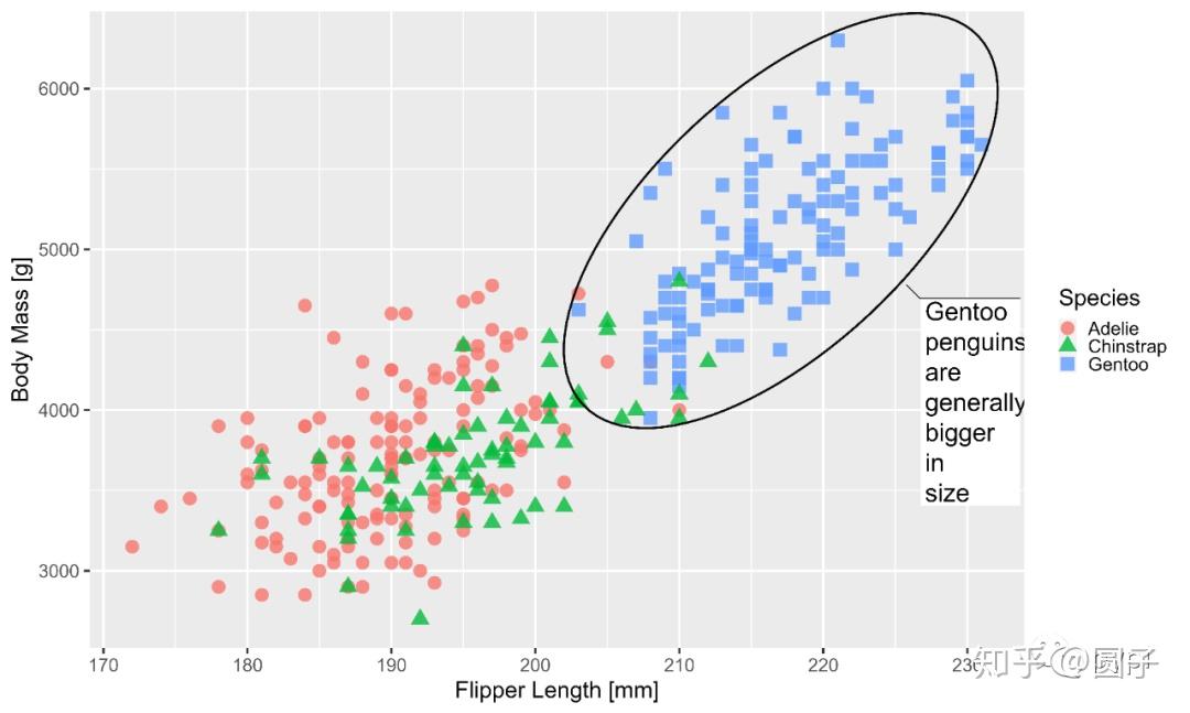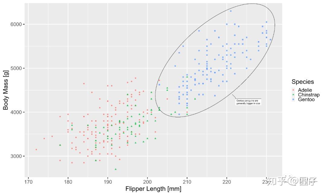 labs(x = "Flipper Length [mm]", y = "Body Mass [g]", colour = "Species",