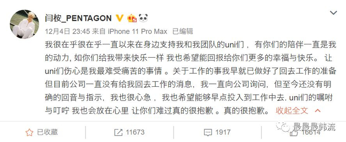 真的能看出来闫桉对Pentagon的感情很深,也满怀期待着能赶紧归队能够一起活动。