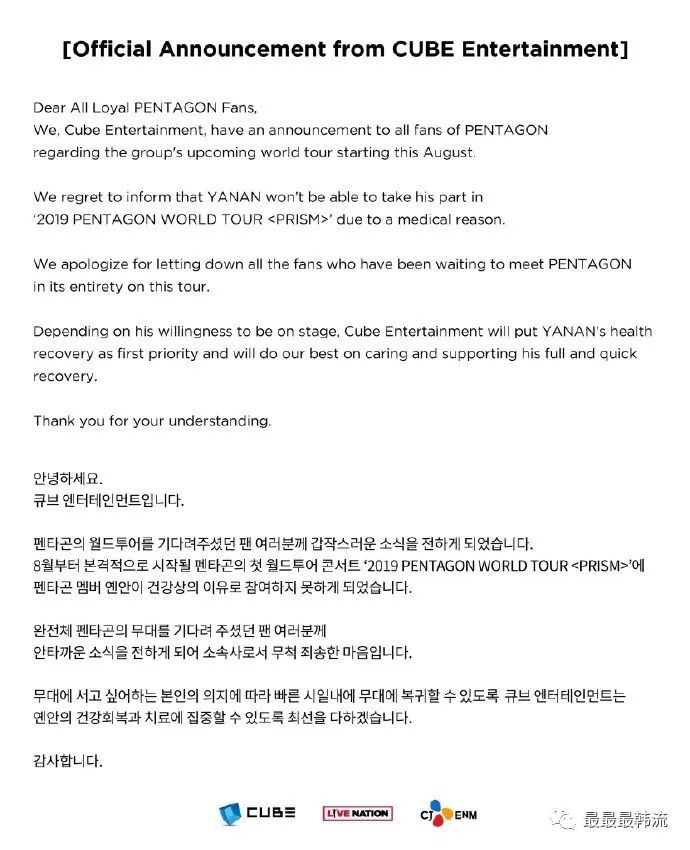 时隔不久CUBE又再次以身体健康原因不让闫桉参加世界巡演,渐渐地就有粉丝开始意识到事情的不对劲。