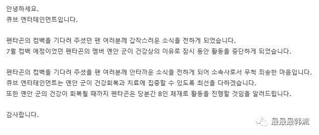 今年夏天CUBE发表声明,闫桉因健康问题不参与活动,Pentagon以八人团进行活动。