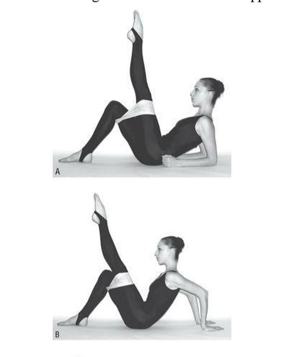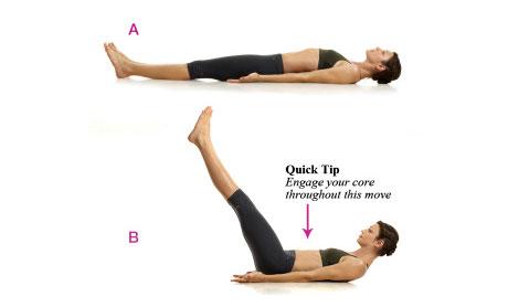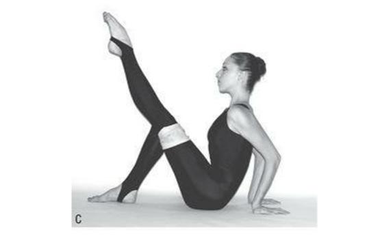 你的注意力应该集中在髂腰肌上。腿要尽力伸直,脚背绷直。腹肌收紧。脚背朝上,