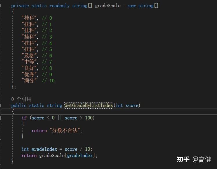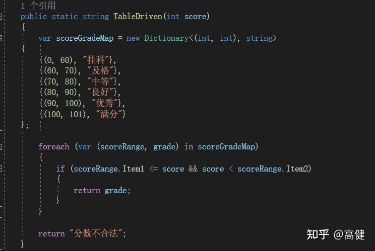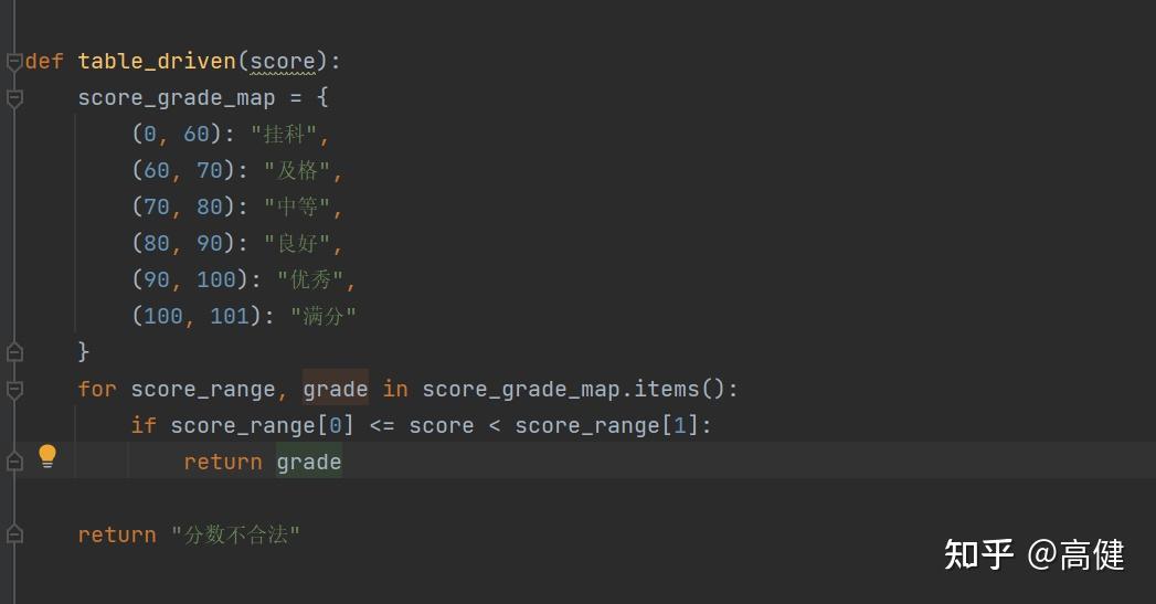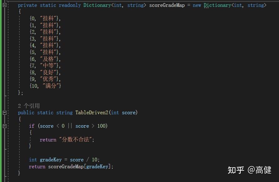 通过观察,可以看到,在表驱动里,通过key取value,比如用3,代表挂科,用6代表及格,用10代表满分。