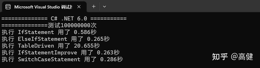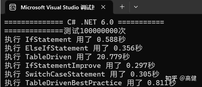 在C#里,跑一亿次,执行速度最快的是依旧是优化版的多if语句,传统的if else 和Switch case紧随其后,最慢的依旧是表驱动。这个性能差距,就太大了。