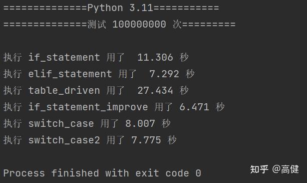 在Python里跑一亿次,可以更清晰的看到优化的if语句和传统if-elif语句执行速度的优势。
