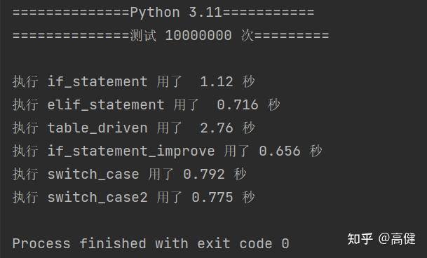 在改进之后,因为及时return,看起来很像Switch-case break,其性能也超过了前两种写法,不过该写法的可读性依旧不如if-elif。如果习惯用多if语句,可以及时return的方法进行优化。