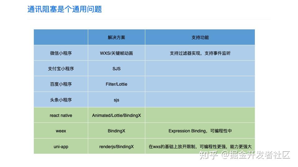 大部分类小程序的跨端框架采用 JavaScript 逻辑层 与渲染层分离的架构。JavaScript 运行在独立环境中,通过桥接与原生通信。这种架构因 web 渲染引擎,常有一些性能问题: