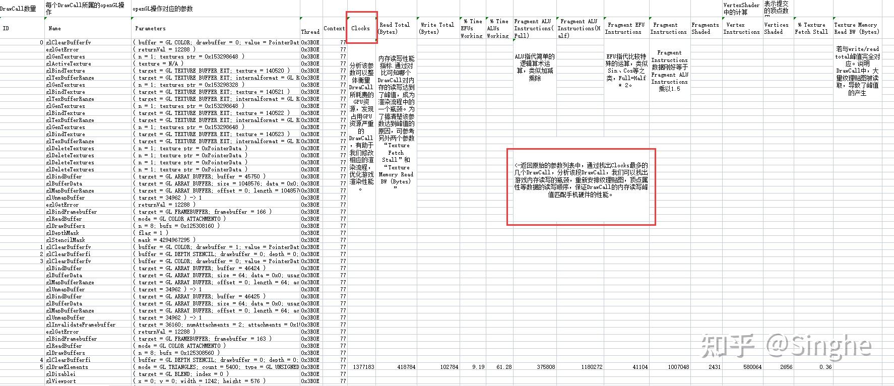 可以将相关数据导出至表格。找出Clocks最多的几个DrawCall,分析该段DrawCall,我们可以找出游戏内存读写的瓶颈,重新安排纹理贴图,顶点属性等数据的读写顺序,保证DrawCall的内存读写峰值匹配手机硬件的性能。