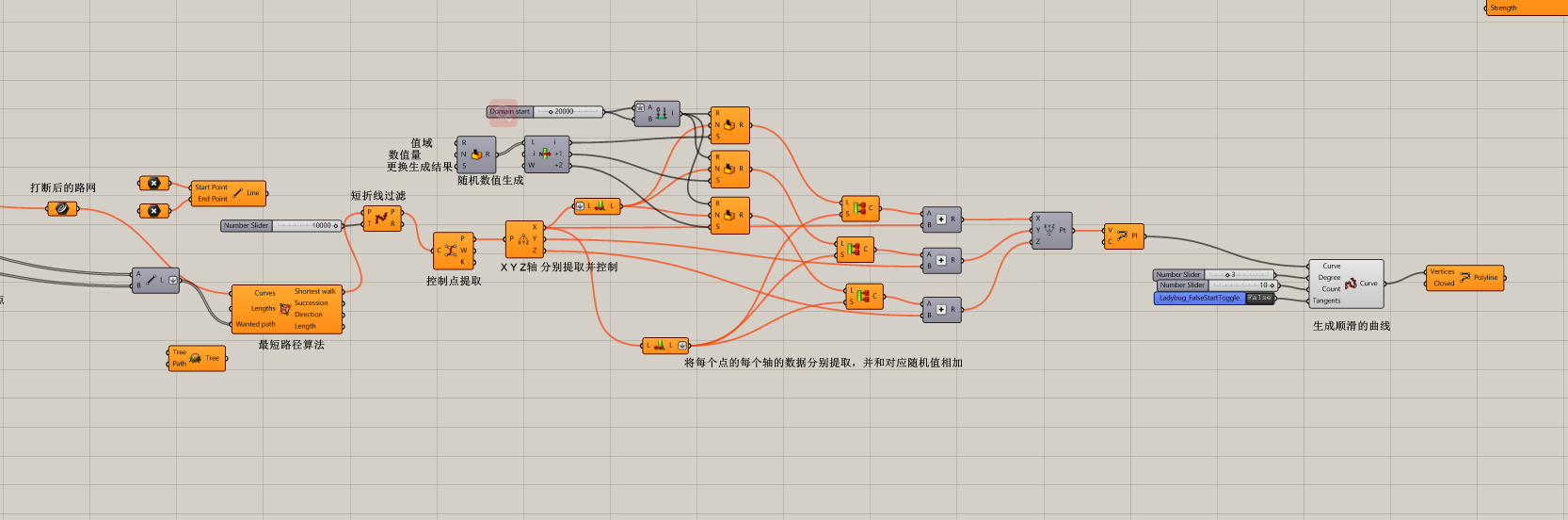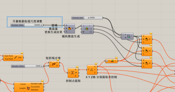 如果在这里就输出结果,我们会发现相同路径内,所有的线都重合了,无法区分流量的多与少。因此,我们需要给每个人流路径添加一个 随机的抖动 ,让人流量多的街道上,抖动的线更多,表现在图面上就是线更密集,线束更粗更明显。因此,我们需要提取每个路径的控制点的x,y,z坐标,给他们分别添加随机的位移。这一部分同样涉及GH数据结构。同时,请 在标注出 “值域,值数量”的随机电池上,根据项目尺度来修改值域 ,使得坐标的抖动在合适的范围内。一般建议, 值域的最大值,不大于街道宽度 。当然,根据效果自行调整是最好的。