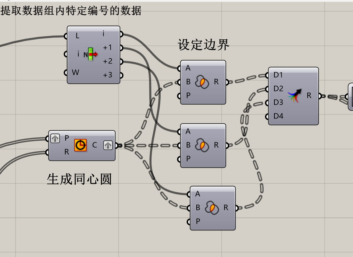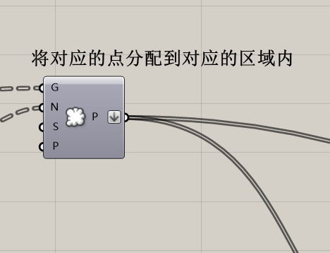 关键电池:在指定的区域内,生成指定数量的点。N端输入端影响了点的总数,点的分配由上一个部分控制,而G端是点生成的范围限制,对应的就是同心圆环。这里涉及了GH的数据结构知识,有兴趣的同学可以自行搜索了解,数据是如何一一对应的(数据的坐标)。