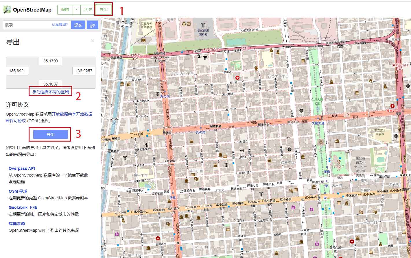 与上期介绍的基于GH生成城市的真实地形+建筑体块的流程相似,首先,我们进入OPEN STREET MAP网站框选对应地块的信息。注意, 地块不能太大,不然会下载失败。