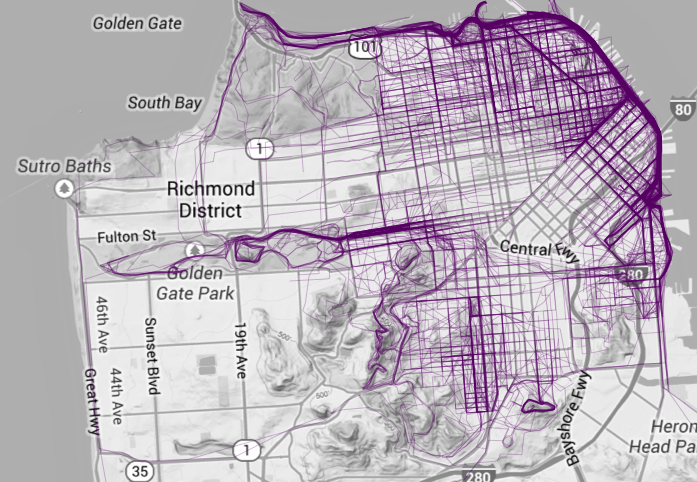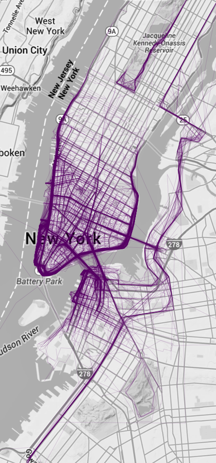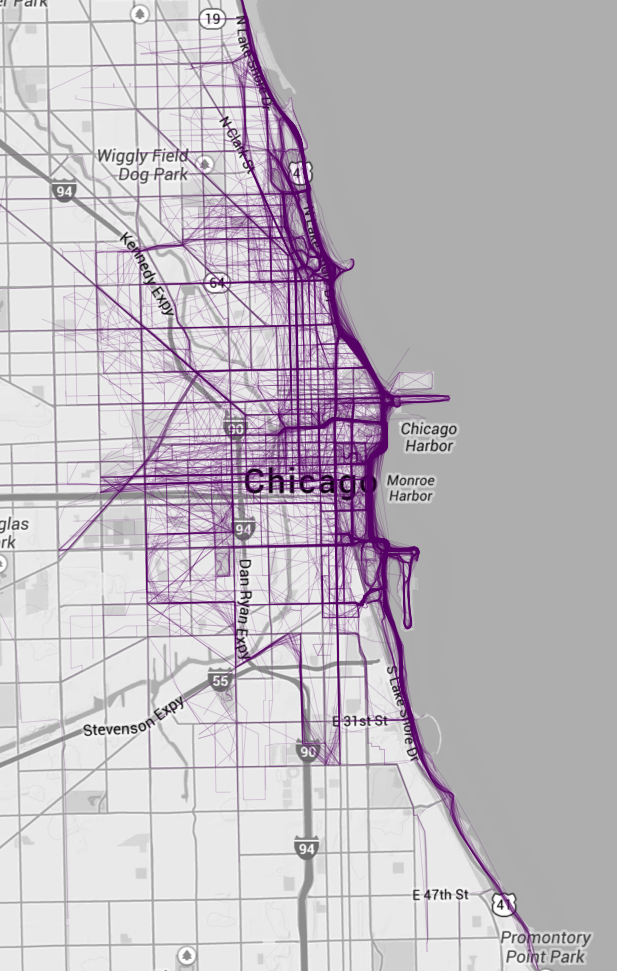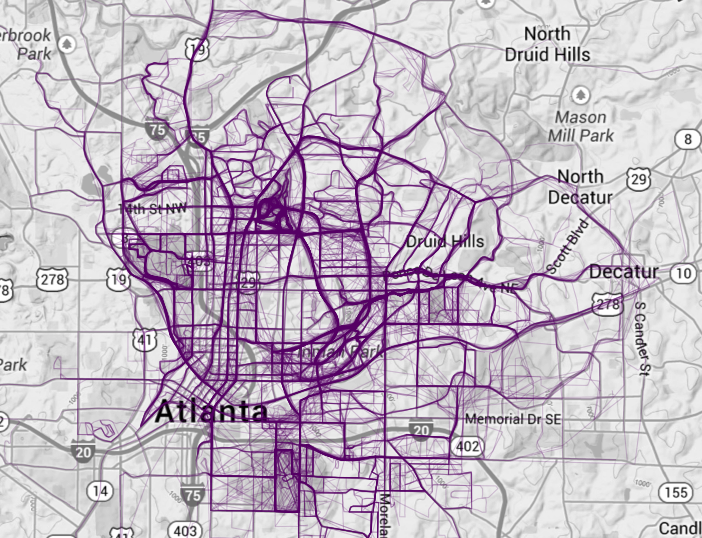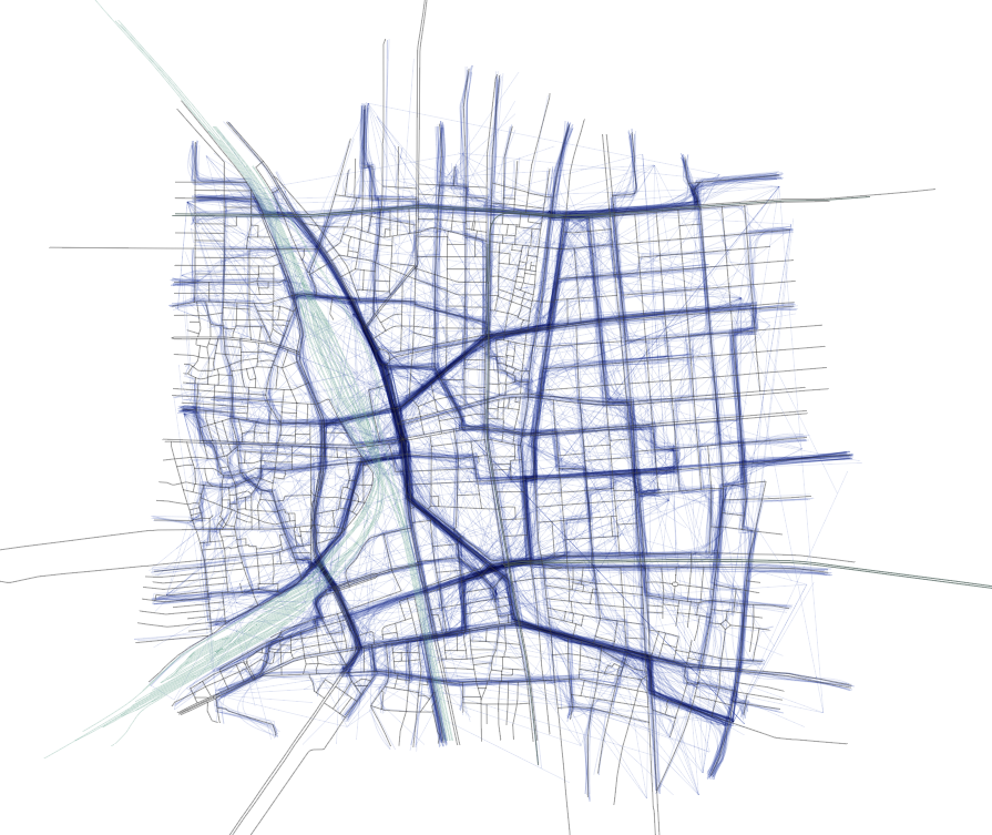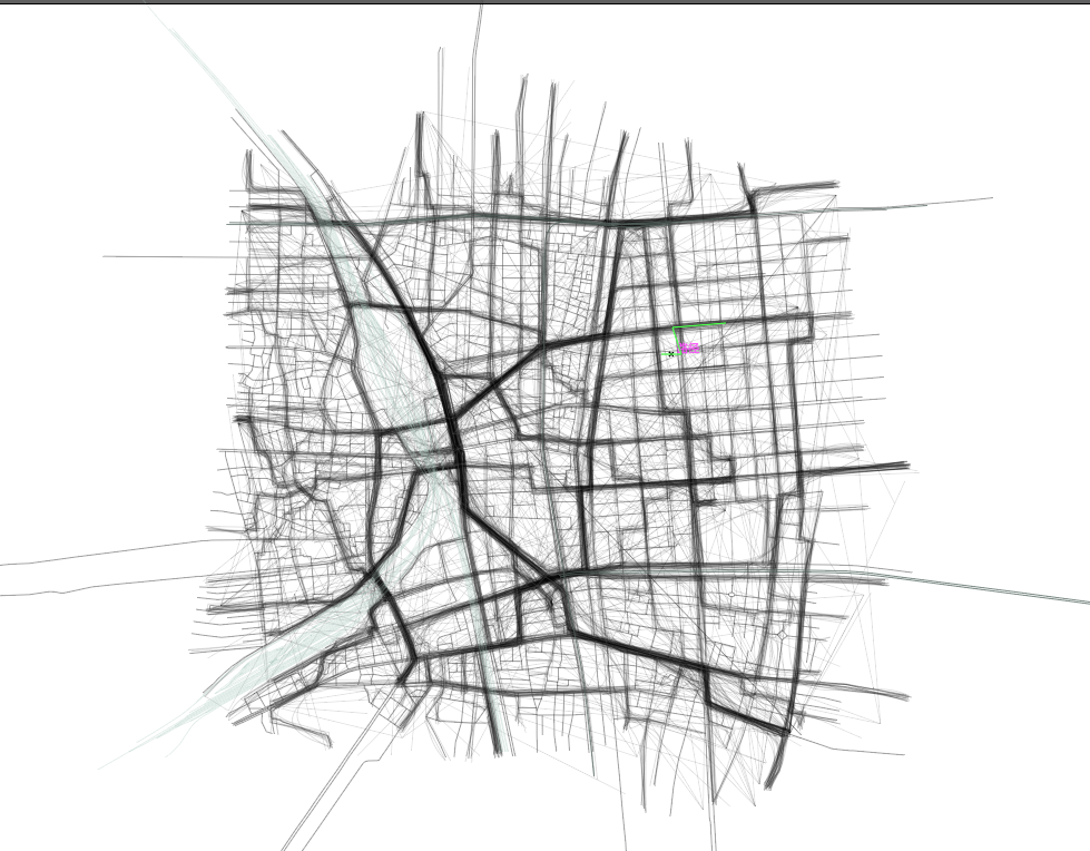 原有路网调细为0.5,透明度70%,使街道结构清晰而不争夺重点。生成的人流路径 线宽0.5,透明度60,%,同时设置覆盖模式为 正片叠底,来模拟线重叠时延伸变深的直观效果。