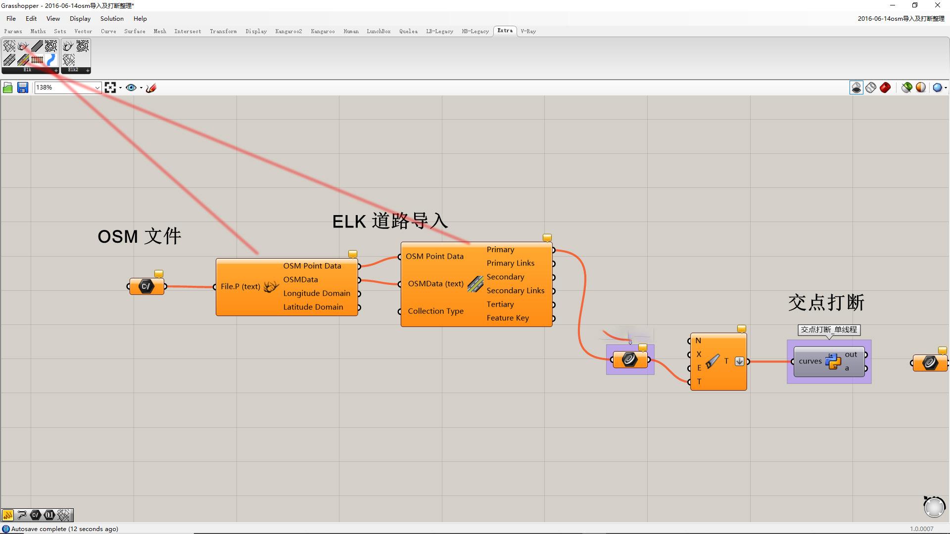 右键File Path,选择单个文件,并找到在OPEN STREET MAP上下载的OSM地图文件。在导入过程卡顿过后,连接第三个电池上你所需的输出口到polyline电池,注意, 不同路需要单独polyline电池来避免错连 。