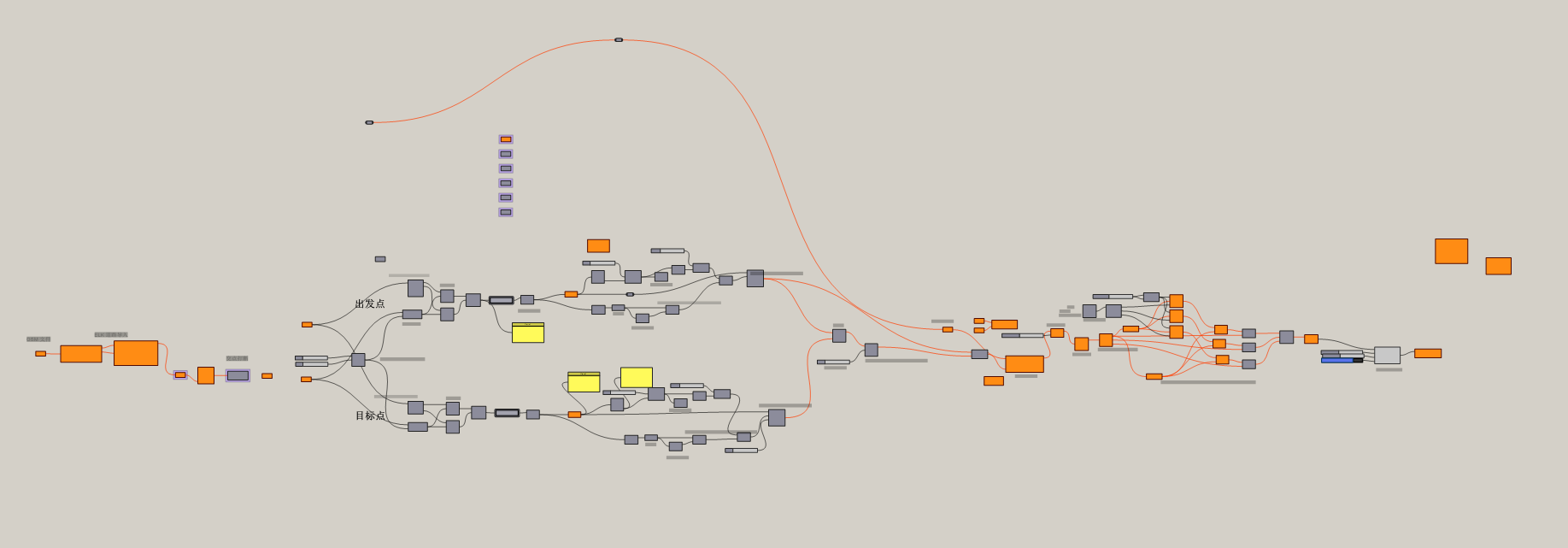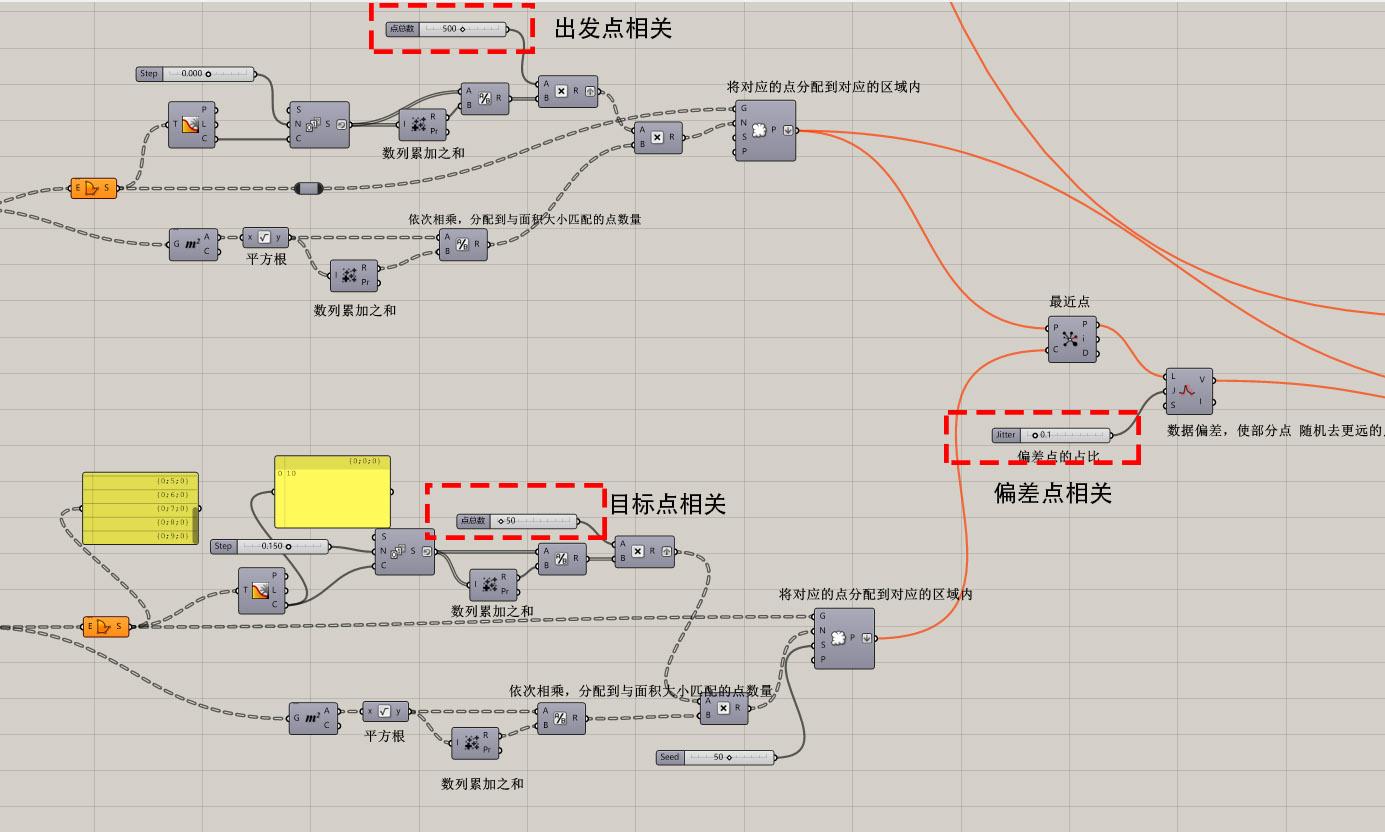 首先我们看一下电池组的全景,并解释原理。人流分析图的规则是, 记录每条街人流的多少 。而在GH里,我们需要生成一定数量的出发点,分布在预定的区域内。同时设定一定数量的终点,以及给出人群行进的路径,也就是我们的街道或者建筑内部流线,然后用运算器模仿并记录整个过程。