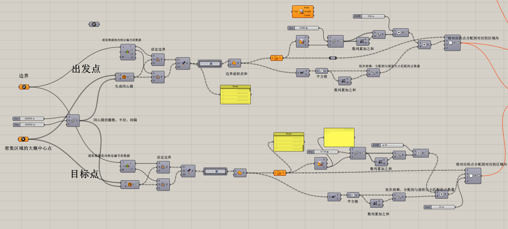 我们来看第一部分的逻辑。我们将rhino里刚画的边界和人流密集中心点分别导入图中标注的电池内。以这些中心点为圆心,我们生成一定数量的同心圆,并移除超出场地边界的部分。然后在同心圆的每一圈间隔内,生成一定数量的点,也就是我们人群的出发点。离圆心越远的圆环,点就越分散,因此符合我们预设的离人流密集强度区域越远,人就越少的规则。不同圆心的同心圆组相交,就表示相交区域的人流会更多。