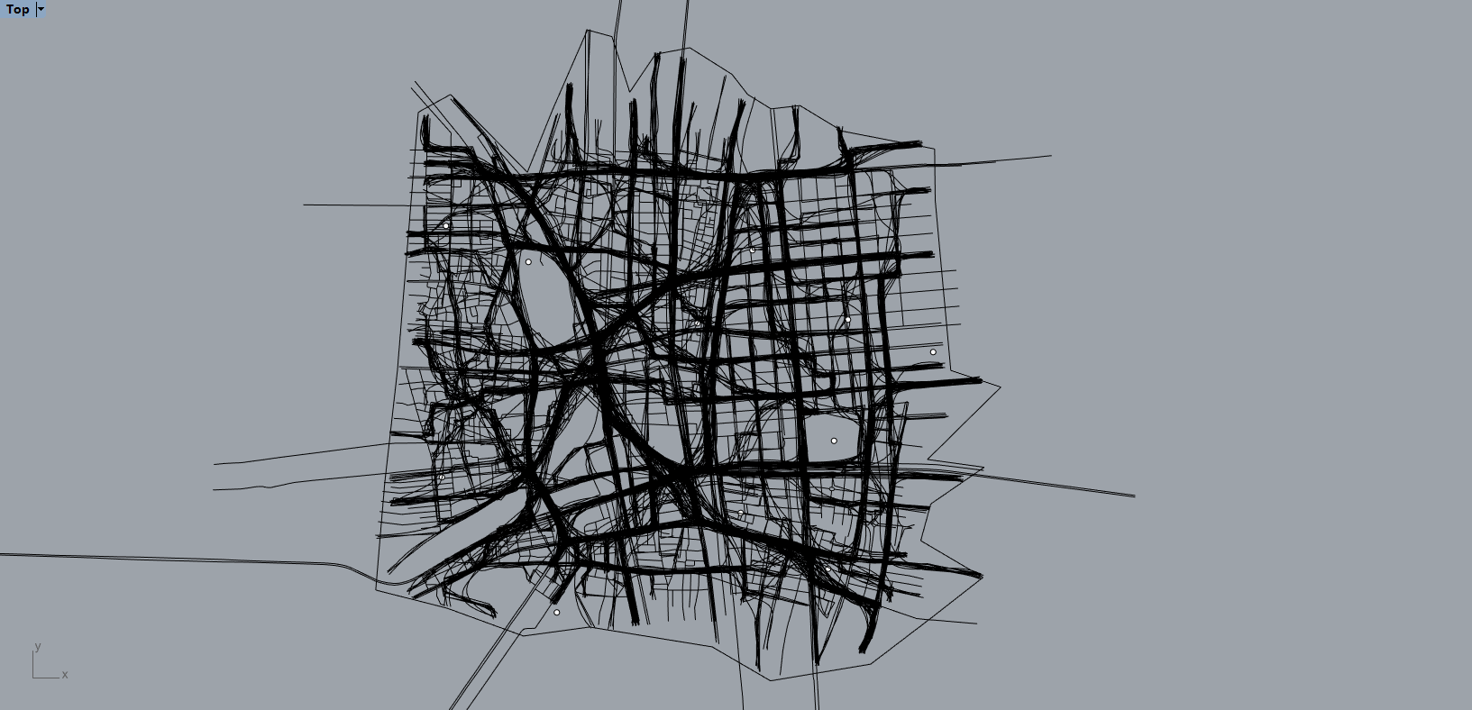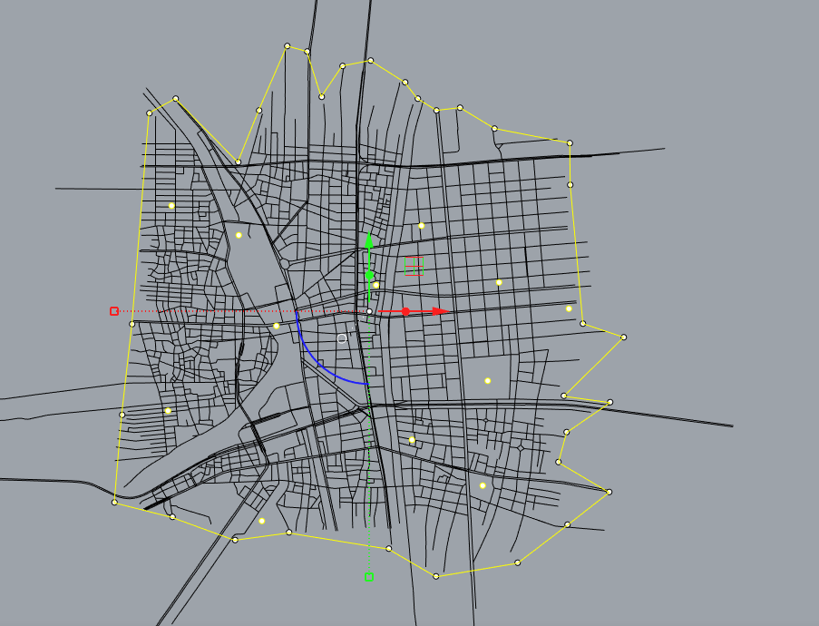 因此,我们需要先做调研或者预设,在我们的地图内选出出几个人群最密集的区域,对应住宅区/商业综合体/大型办公区等等。在第一步我们bake出来的街道线稿上,我们在rhino界面点出几个点,代表这些区域的大概中心,同时,我们需要手动粗略的用多段线勾勒出人流可以到达的区域的边界,避免代表人流的点出现在不应该有人流的区域,比如悬空的部分,海洋,山脉等。