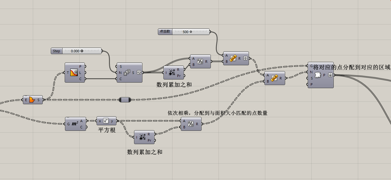 这一部分,只需要调整点总数,同样的,请根据电脑性能和项目尺度调整。这一部分的原理是, 根据每一个边界区域内每一个同心圆环的面积,来分配不同数量的点,以保证点的数量不会因为圆环被地形移除一部分后,出现堆积现象 。换句话说,我们不希望原本应该点数分布稀疏的圆环,因为被切割大部分面积,点数被挤压在少数区域,导致结果出现明显的偏差。